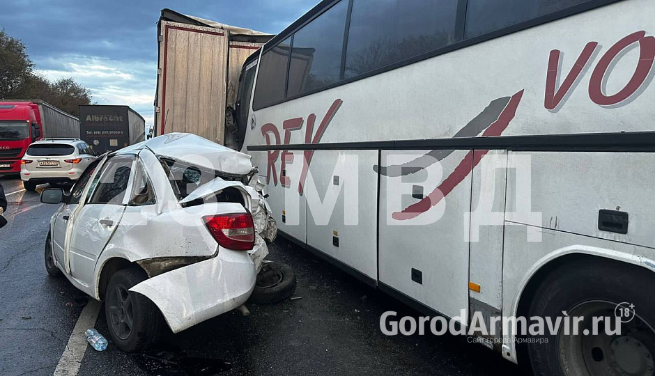 Армавир, 7 ноября. Серьезное ДТП с 1 погибшим и 2 травмированными людьми произошло 6 ноября на ФАД «Кавказ». В Успенском районе водитель автобуса «Сетра» допустил столкновение с автомобилем «Лада Гранта».