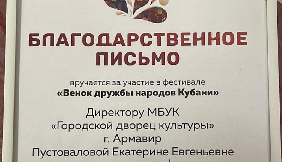 Армавир, 2 декабря. В Краснодарской филармонии им. Г. Ф. Пономаренко прошел краевой фестиваль «Венок дружбы народов Кубани». В этом году в фестивале участвовали национальные коллективы из муниципальных образований края, в том числе и Армавира.
