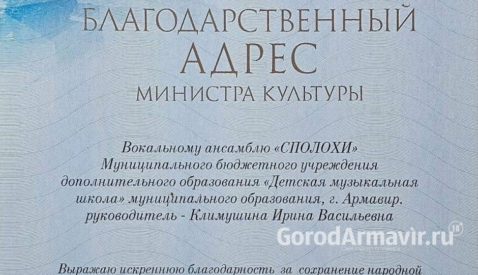- Вокальный ансамбль «Сполохи» из Армавира стал лауреатом I степени и получил благодарственный адрес министра культуры Новгородской области, - рассказали порталу gorodarmavir.ru в отделе культуры администрации муниципального образования город Армавир.