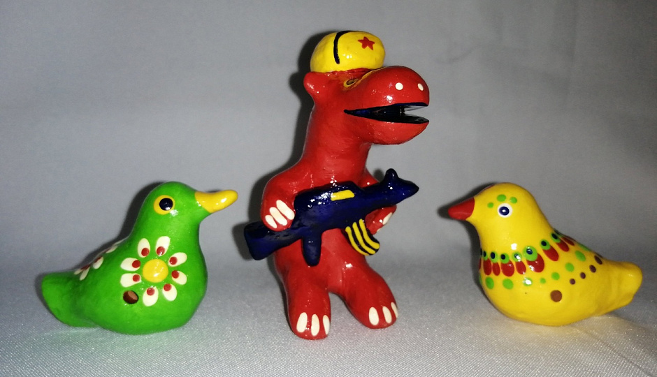 - У меня такой интересный заказ! Одна наша крупная информационная компания работает в Африке. Они заказали мне свистульки в виде крокодилов и бегемотиков, но с русской символикой. Поэтому крокодилы у меня с русским флагом, а бегемоты - с Калашниковым и в ушанке. Так заказчик захотел. Очень трудоёмкая работа получилась! Но очень весёлая, - написал художник на своей официальной страничке в социальных сетях.