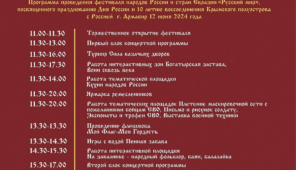 Огненное шоу и тульские богатыри: опубликована подробная программа фестиваля «Русский мир» в Армавире