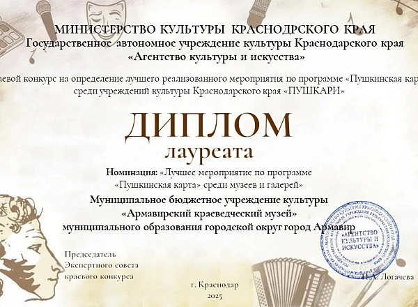 Армавирский краеведческий музей стал лауреатом в номинации "Лучшее мероприятие по программе «Пушкинская карта»