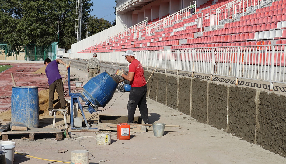 Также специалисты штукатурят трибуны и заливают бетон. Работы планируется завершить в октябре текущего года. Ремонт стадиона проводится в рамках государственной программы «Развитие физической культуры и спорта».