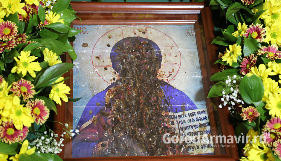 Икона начала кровоточить в 2000 году, и с тех пор кровь почти полностью покрыла лик Спасителя. Раньше она хранилась в монастырях Украины, а теперь находится в частной коллекции. В день прибытия благотворительный фонд также передал в дар Армавирской и Лабинской епархии образ Нектария Эгинского и памятную медаль.