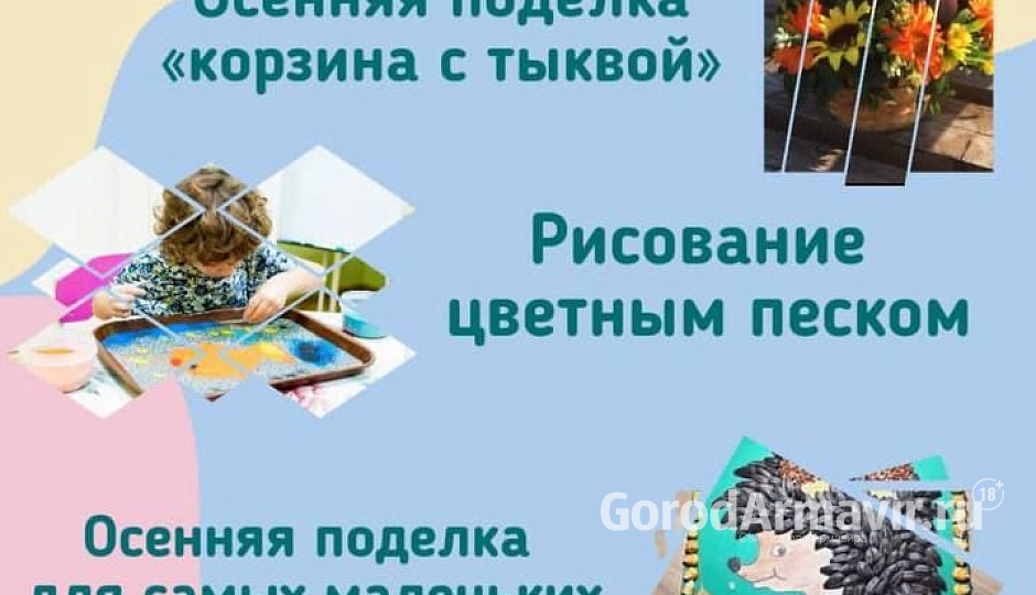 Дети научатся рисовать красками ЭБРУ, сделают осеннюю поделку «Корзина с тыквой», будут создавать картины цветными песком. Также с армавирцами поиграют аниматоры.