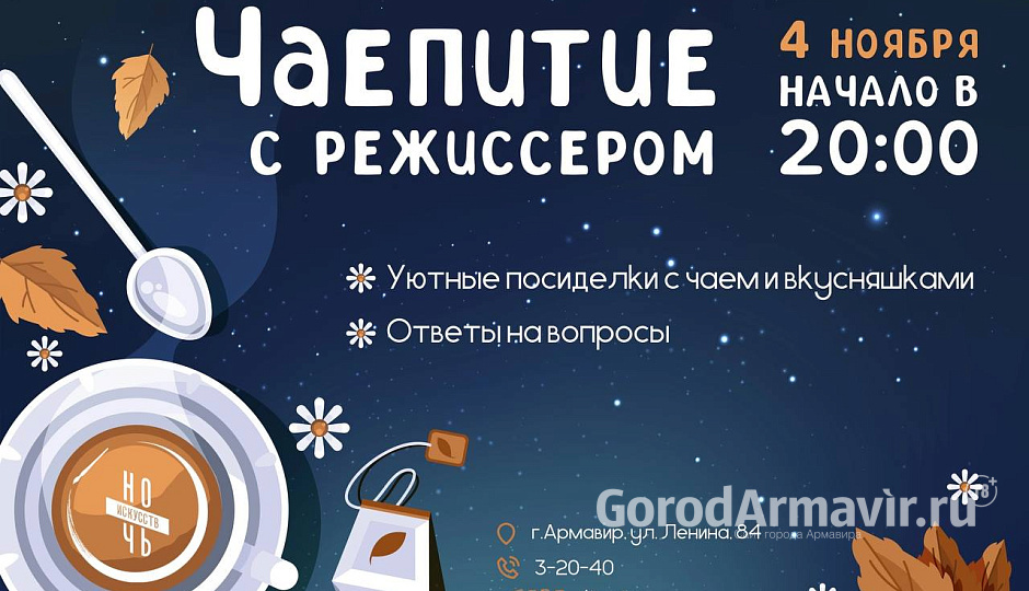 В 20:00 в театре начнется "Чаепитие с режиссером". Гости смогут провести вечер в уютной атмосфере и обсудить работу театра с главным режиссером, заслуженным деятелем искусств Краснодарского края Юрием Алексеевичем Ковалевым.