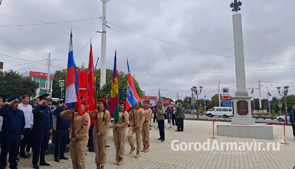 Армавир, 20 сентября. В Армавире торжественно открыли стелу «Город воинской доблести». Она установлена на пересечении улиц Ефремова и Розы Люксембург. На церемонию собрались сотрудники администрации, депутаты, представители общественности. юнармейцы, студенты.