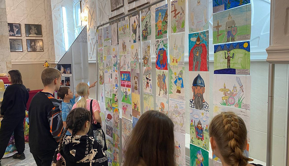 Выставка детских работ располагается в фойе первого этажа. Школьники со всего города с помощью кисти и красок, карандашей и даже пластилина воплотили свои фантазии о необычных подвигах смелого богатыря.