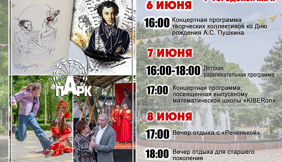 В Городком парке 6 июня в 16:00 запланирована концертная программа ко Дню рождения А.С, Пушкина.