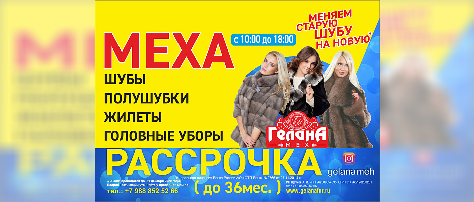 На выставке меховой компании «Гелана» действует акция «Меняем старую шубу на новую», в рамках акции покупатель, предоставивший бывшее в употреблении меховое изделие, может обменять его и приобрести на представленный на выставке-продаже товар со скидкой от 3.000 рублей до 15.000 рублей, подробности можно узнать у продавцов-консультантов на выставке.