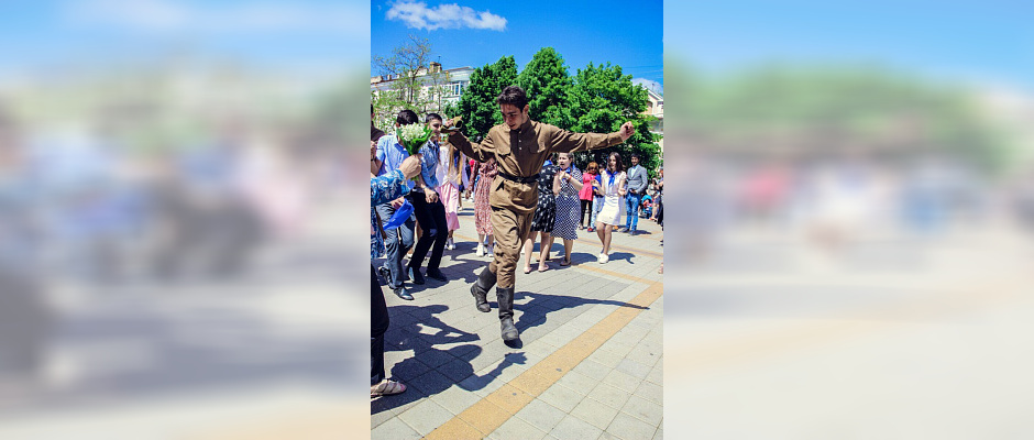 Армавир, 10 мая. В честь праздника Великой Победы горожане пустились в пляс под музыку военных лет. Принять участие в массовом танцевальном флешмобе армавирцев пригласили студенты, школьники и волонтеры.