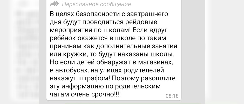 В сообщении, которое пересылают друг другу жители Армавира, сказано, что в целях безопасности с завтрашнего дня будут проводиться рейдовые мероприятия по школам. Если вдруг ребёнок окажется в школе, то родители будут наказаны. Также детей будут искать в автобусах, на улицах и магазинах.
