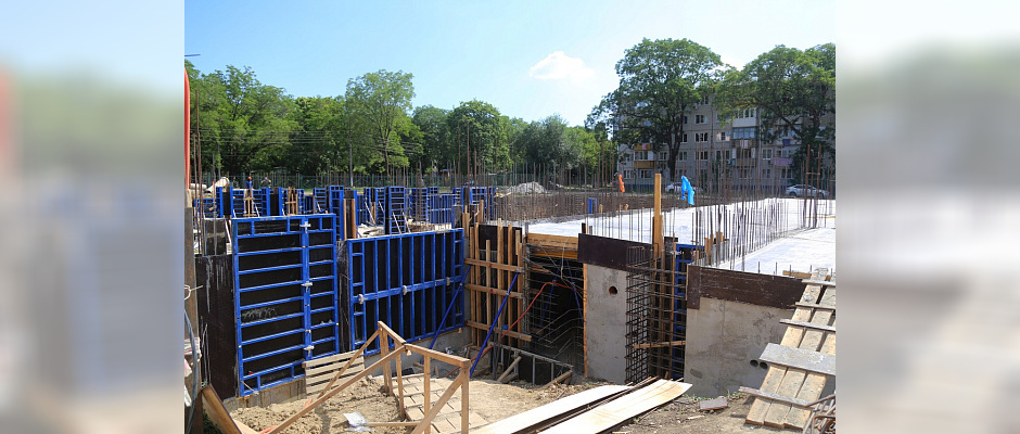 Строительные бригады уже залили фундаментную плиту. Сейчас возводятся наружные стены и колонны цокольных этажей, демонтируется опалубка, идет монтаж плит перекрытия нулевого уровня.