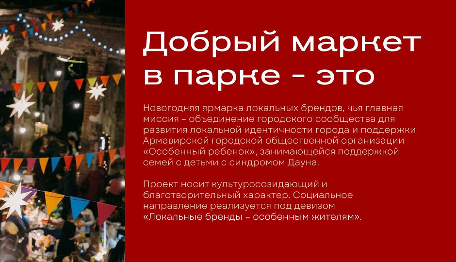 «Добрый маркет» реализуется под девизом «Локальные бренды – особенным жителям»: он позволяет объединить на одной площадке талантливых мастеров Армавира и использовать их объединяющую силу в благих целях. Проект ориентируется на развитие культурного кода города и привлекает внимание к проблеме интеграции детей с особенностями развития.