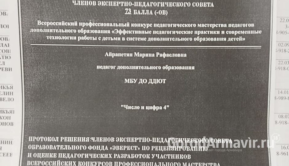- Педагогу дополнительного образования Дворца детского и юношеского творчества Марине Айрапетян вручили диплом за 2 место, - рассказали в ДДЮТ Армавира.