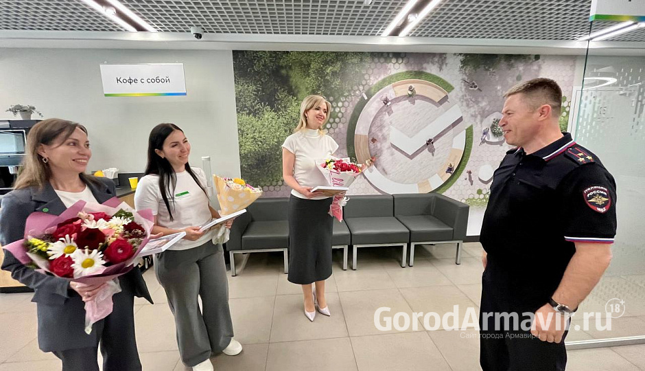 Начальник ОМВД России по городу Армавиру полковник полиции Ярослав Степаненко вручил благодарственные письма руководителю дополнительного офиса ПАО «Сбербанк» Виктории Ефремовой, ее заместителю Ирине Лазаревой и менеджеру Кристине Мирзоян за активную гражданскую позицию и грамотные действия.