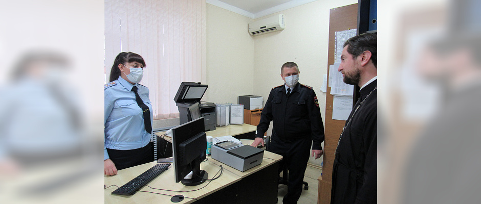 Инспектор отдела по вопросам миграции Отдела МВД России по городу Армавиру капитан полиции Евгений Полковников ознакомил члена Общественного совета Андрея Солопа с информационными стендами, бланками заявлений и информационными памятками, которые вручают гражданам при посещении подразделения.