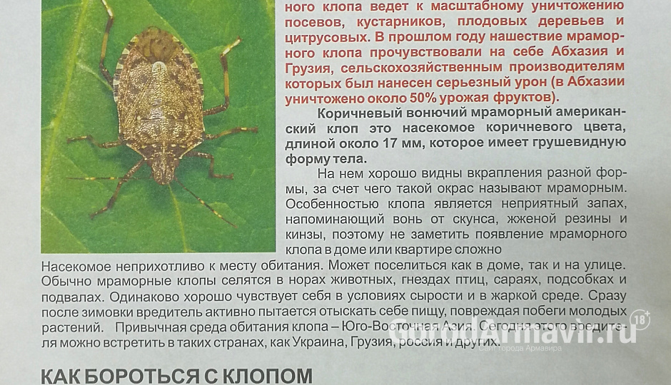 – Он выходит из мест зимовки и сейчас его лучше собирать вручную. В течение месяца они уже начнут откладывать личинки, тогда обработку проводят химическими способами. Бороться с ним обязательно нужно, потому что это карантинный вредитель и он повреждает многие известные культуры, в том числе плодовые растения, виноградники и ягодники – рассказал корреспонденту Gorodarmavir.ru начальник отдела сельского хозяйства и перерабатывающей промышленности Владимир Чемеричко.