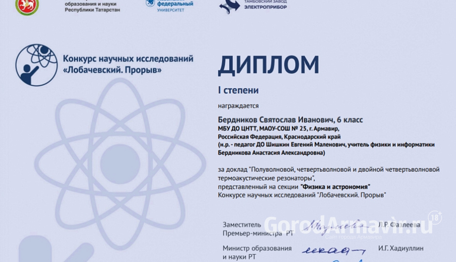 Ученики школы № 25 Армавира стали участниками конкурса научных исследований «Лобачевский. Прорыв»