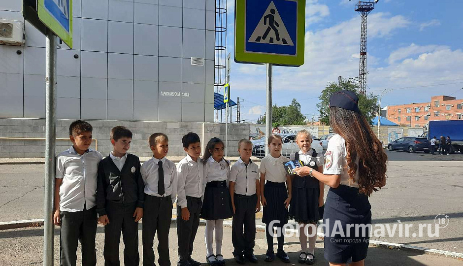 Армавир, 21 сентября. Сотрудники ОГИБДД Армавира провели со школьниками профилактическое мероприятие «Заметный пешеход». Прямо возле школы ребятам наглядно продемонстрировали дорожные знаки и разметку.