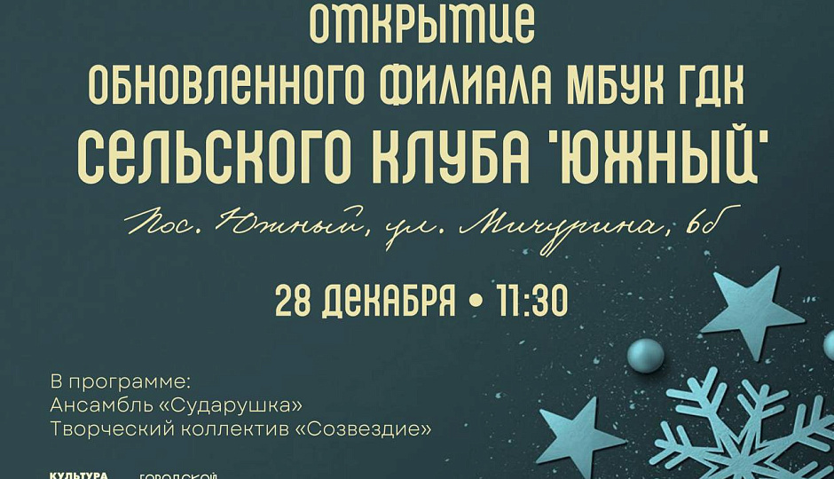 28 декабря в 10:30 свои двери снова распахнет филиал Городского Дворца культуры - сельский клуб «Маяк». В праздничную поздравительную программу войдут выступления вокального ансамбля «Русская песня» и Духового оркестра Городского Дворца культуры.