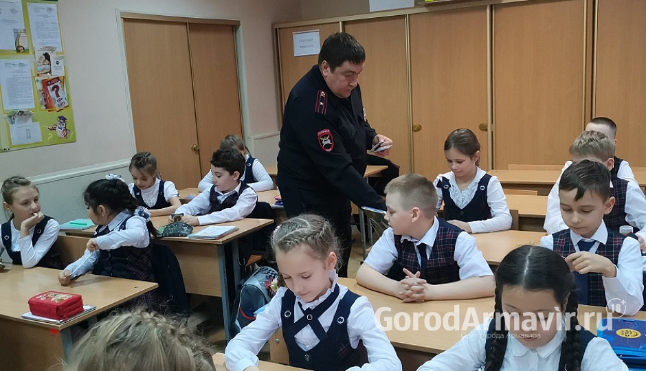 Армавир, 14 января. Командир отдельного взвода ДПС ГИБДД майор полиции Андрей Стягов с учащимися МБОУ гимназия №1 города Армавира провел профилактическую беседу по Правилам дорожного движения «Стань заметней».