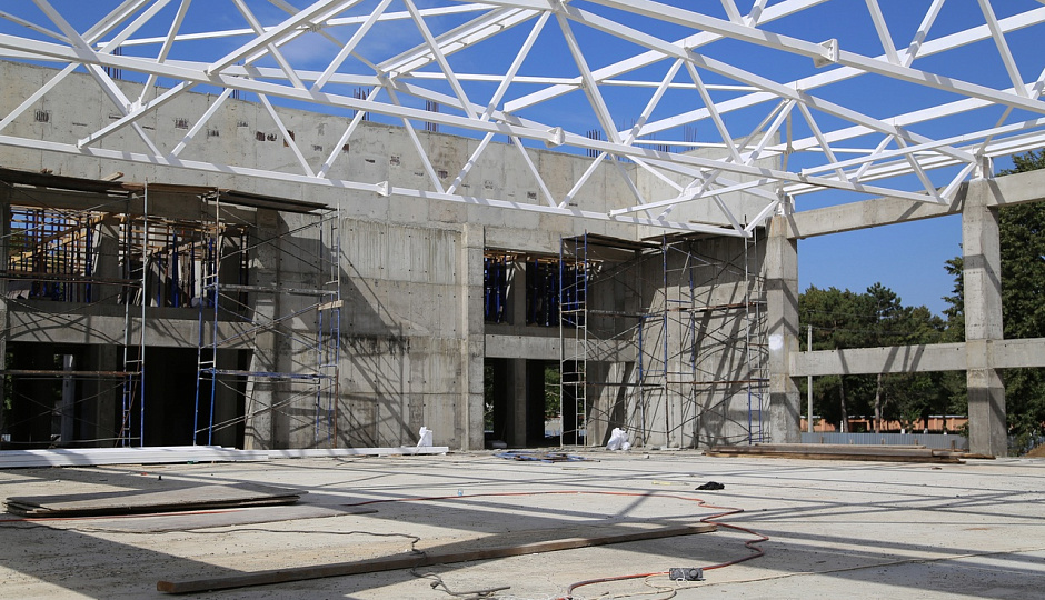 Сейчас здание готово на 55%. На объекте выполняются работы по устройству железобетонного каркаса, проводится монтаж металлоконструкций покрытия.