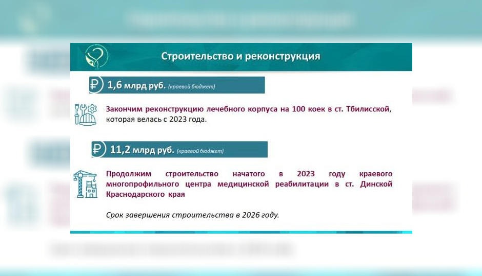 - На капремонт 30 медучреждений в этом году будет направлено 1,9 млрд рублей. Почти вся сумма – краевой бюджет. Планируем достроить 11 поликлиник, установим 11 ФАПов и начнем строить 11 офисов ВОП. Закупим тяжелое оборудование – поставим КТ в Лабинск, ангиограф в Армавир и Сочи, - сообщила вице-губернатор Анна Минькова в своем Telegram-канале.