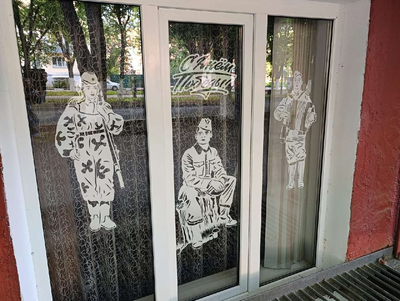 В Армавире георгиевские ленты, изображения героев войны, атрибутику Победы разметили на окнах школ, детских садов, муниципальных учреждений и частных компаний.