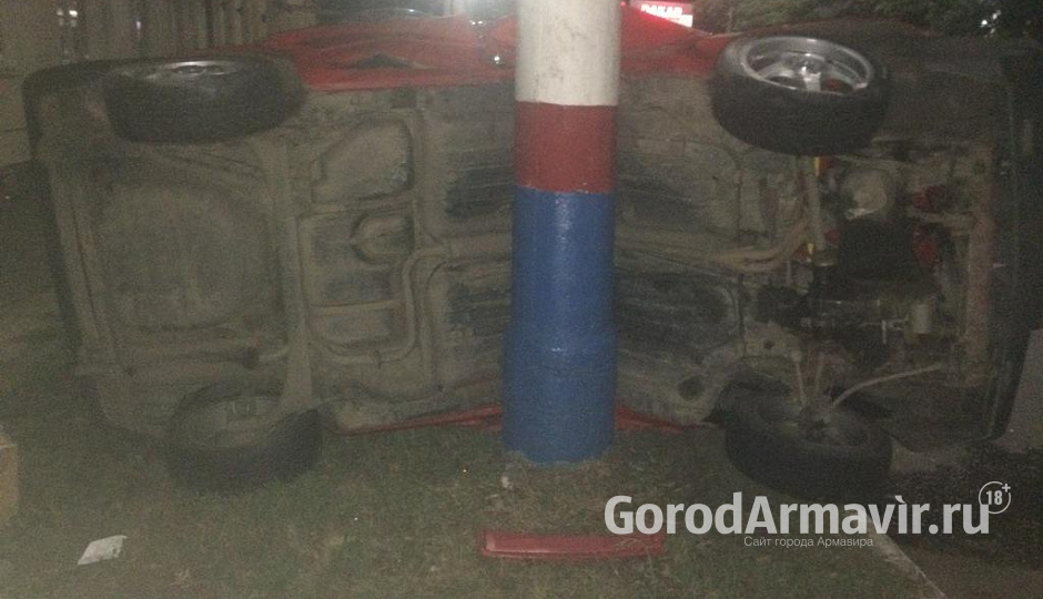 Отечественная «девятка» врезалась в столб и перевернулась ночью в Армавире