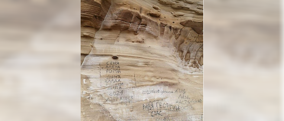 Одна из свежих надписей возмутила пользователей социальных сетей. На фото видно, что на стене пещеры написано «Армавир 2021».